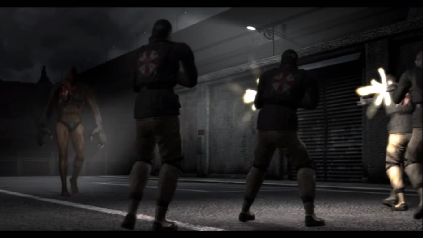 Mientras tanto, un equipo de mercenarios del U.B.C.S. se encuentra con Thanatos, un Tyrant experimental creado por el ex investigador de Umbrella Greg Mueller, quien fue trascendental en la creación del antivirus Daylight como un medio para combatir el virus-T. Mientras tanto, el miembro operativo del U.B.C.S., Nikolai Zinoviev, intenta obtener una muestra de sangre del Tyrant, disparándole con una cápsula diseñada para extraer sangre en un tubo de vacío. La criatura resiste, aunque, el Tyrant tras rápidamente aniquilar al equipo U.B.C.S., regresa a la universidad.
