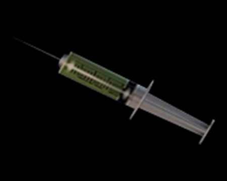 | “ | Una pequeña jeringuilla para uso médico llena de disolvente. | ” |
