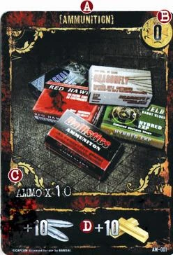 D - Icono de Bonus: Aqui se muestra cualquier bonus que de la carta. Por ejemplo, esta carta da +10 de Municion y +10 de Oro