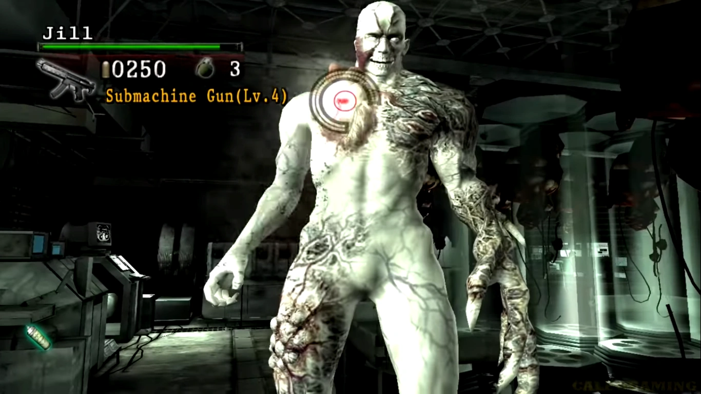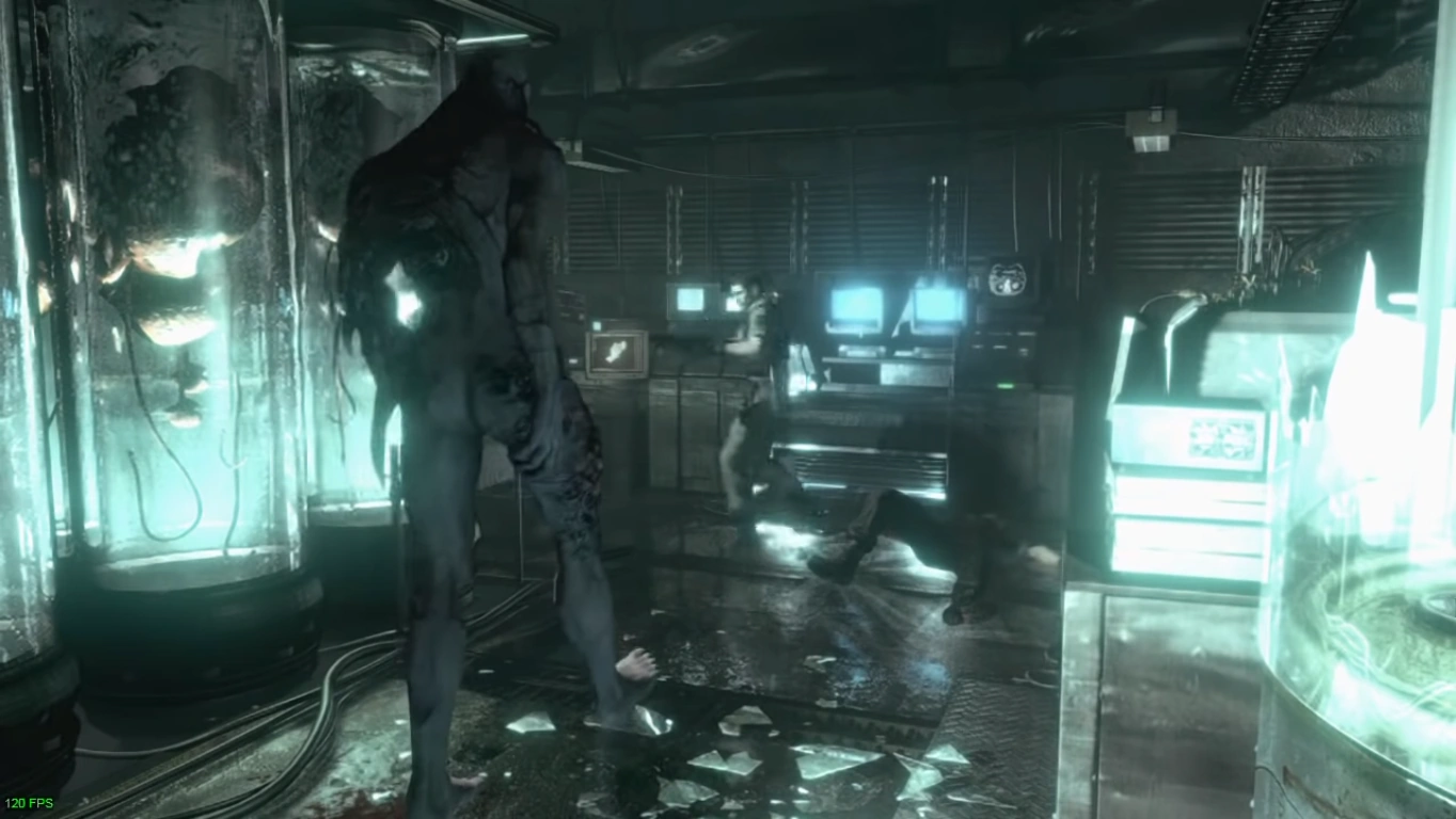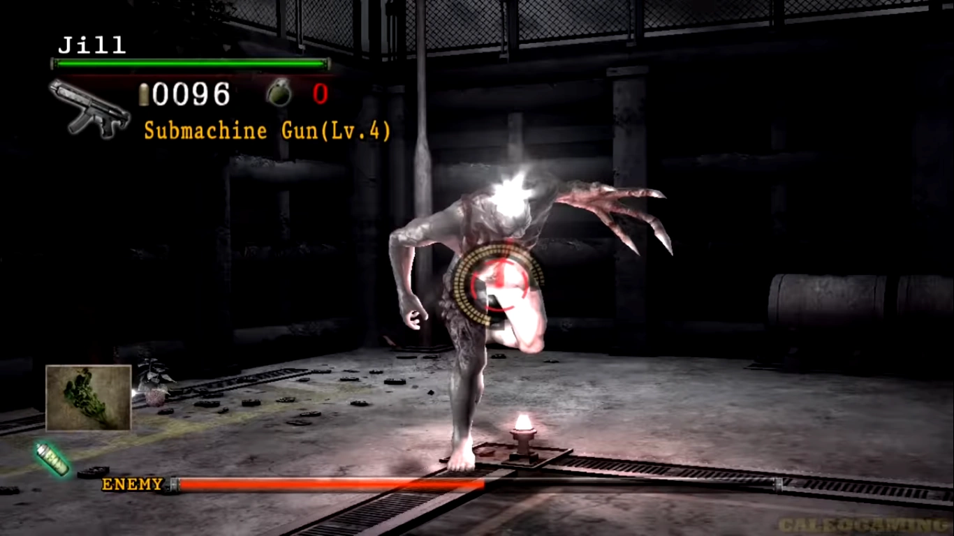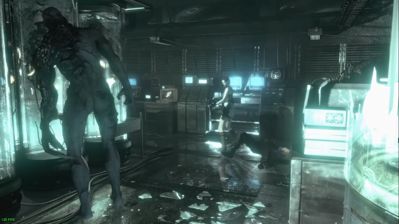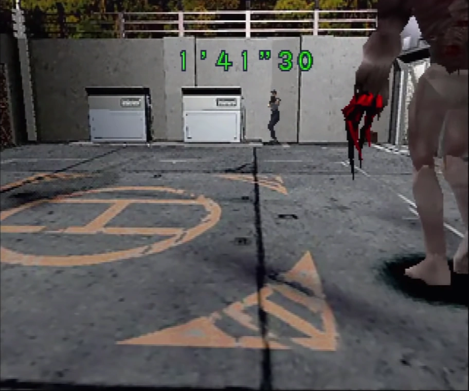 Si ubicamos a Chris en ese lugar, al Tyrant caminar en una linea recta, Chris no fallará ninguno de sus disparos como si puede suceder dentro del laboratorio.