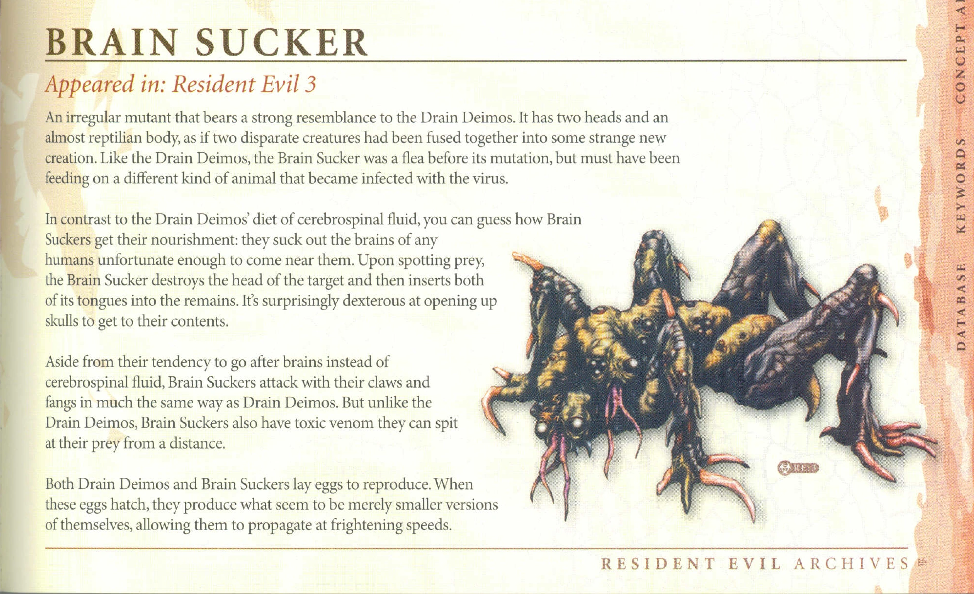 Le Brain Sucker est une créature de Resident Evil 3: Nemesis. Il est semblable au Drain Deimos si ce n'est qu'il peut empoisonner ses victimes.