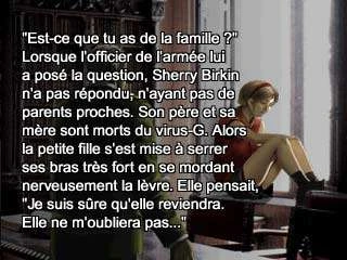 <poem> "Est-ce que tu as de la famille ?" Lorsque l'officier de l'armée lui a posé la question, Sherry Birkin n'a pas répondu, n'ayant pas de parents proches. Son père et sa mère sont morts du virus-G. Alors la petite fille s'est mise à serrer ses bras très fort en se mordant nerveusement la lèvre. Elle pensait : "je suis sûre qu'elle reviendra. Elle ne m'oubliera pas..."