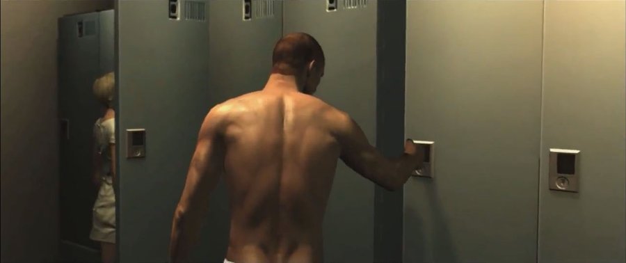 Jake et Sherry cherchant des vêtements dans les casiers du vestiaire.