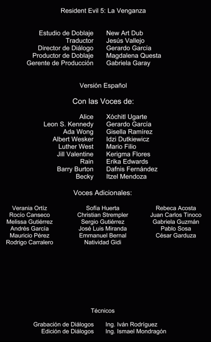 2. RESIDENTEVIL5CREDITOS.png (Spanish). Doblaje Wiki. Retrieved on 2023-08-27.