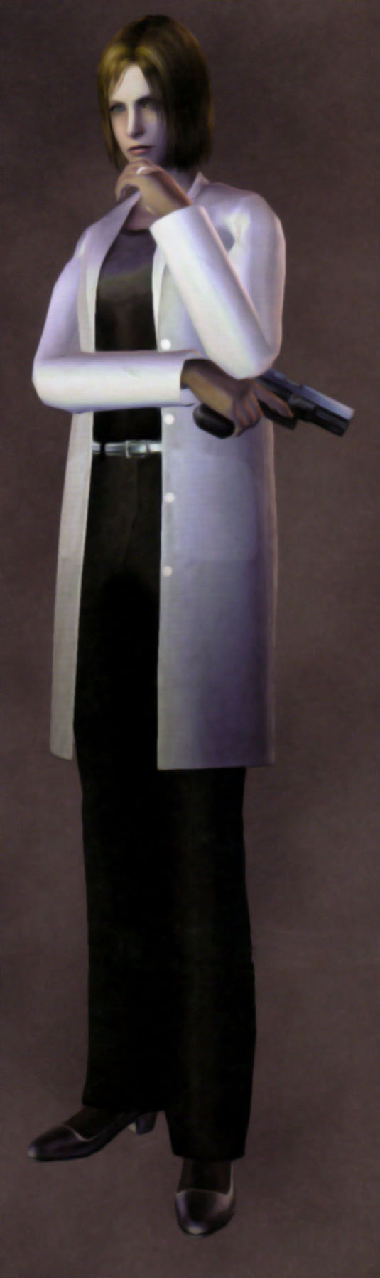 Whether she met Sherry in the sewers is also contradictory, but she did become aware that Sherry was infected with Golgotha by way of parasitism of a G-embryo. She gave instructions to Redfield to obtain a sample of the vaccine within NEST. While as a mother she was frightened for Sherry's safety, as a scientist she had already determined that Sherry's successful mutation into another creature like her father would be a risk to millions beyond the confines of Raccoon City.