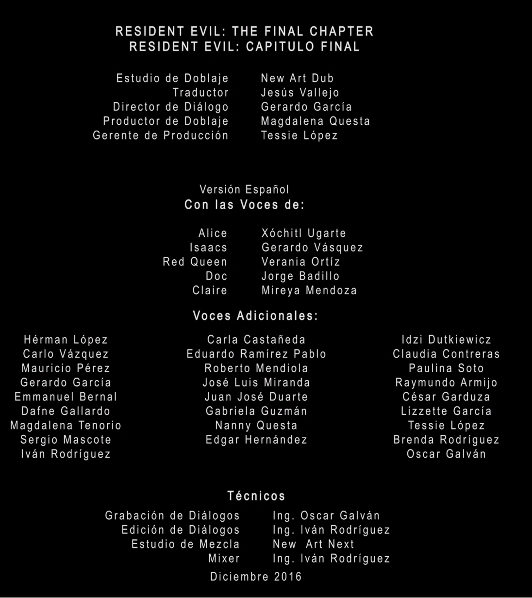 - ↑ RESIDENTEVILCREDITOSCAPITULOFINAL.png (Spanish). Doblaje Wiki. Retrieved on 2023-08-27.