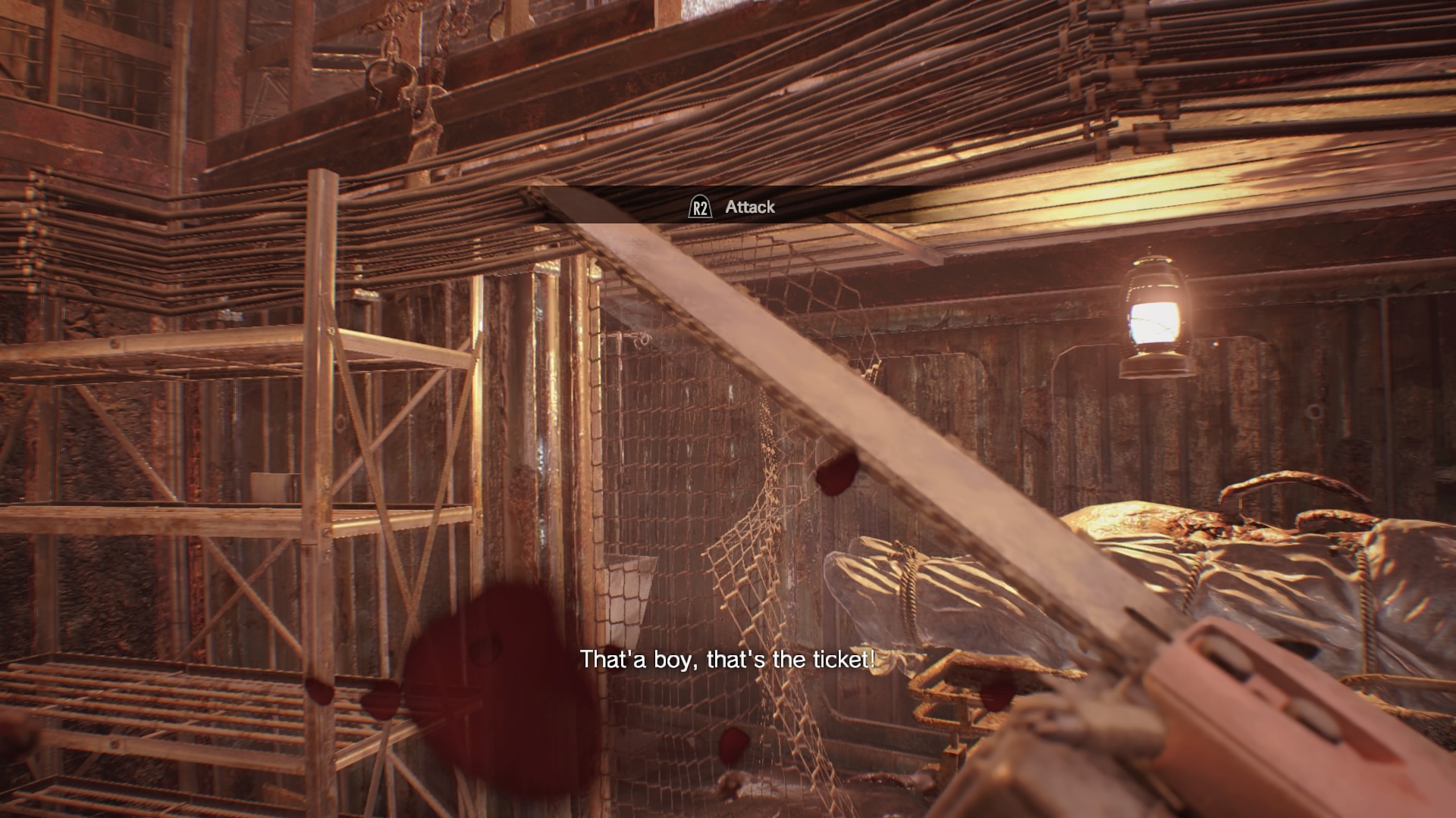 The fire button will make Ethan swing the Chainsaw and holding the aim and fire buttons will make Ethan hold the Chainsaw with a continuous hitbox active. Ethan needs to restart the engine using the reload button in order to use it again after using it for a certain amount of time. Jack is capable of utilizing an insta-kill attack that can be blocked by attacking with the Chainsaw and having the weapons collide.