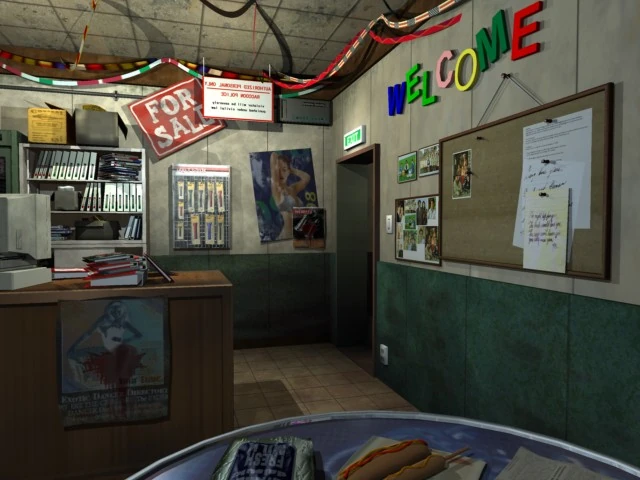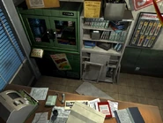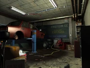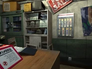 The office is in shambles, with an untidy counter at the back bearing a computer and cash register along with the storage unit containing the Machine Oil and a First Aid Spray. A shelf of on-sale car wash products lines one wall along with a magazine rack and potted plant, and against another wall lies a drink dispenser. In the middle is a table with half-eaten food on it and three knocked-over chairs around it. A door at the back leads into the maintenance garage, where a car can be seen currently under repair.