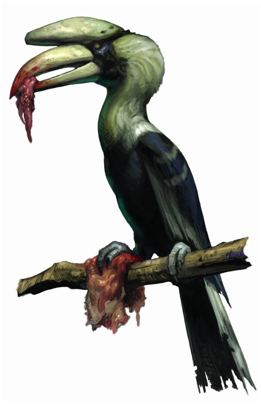 The Hornbill is a Great Indian Hornbill (Buceros bicornis) which has been infected with the t-Virus.
