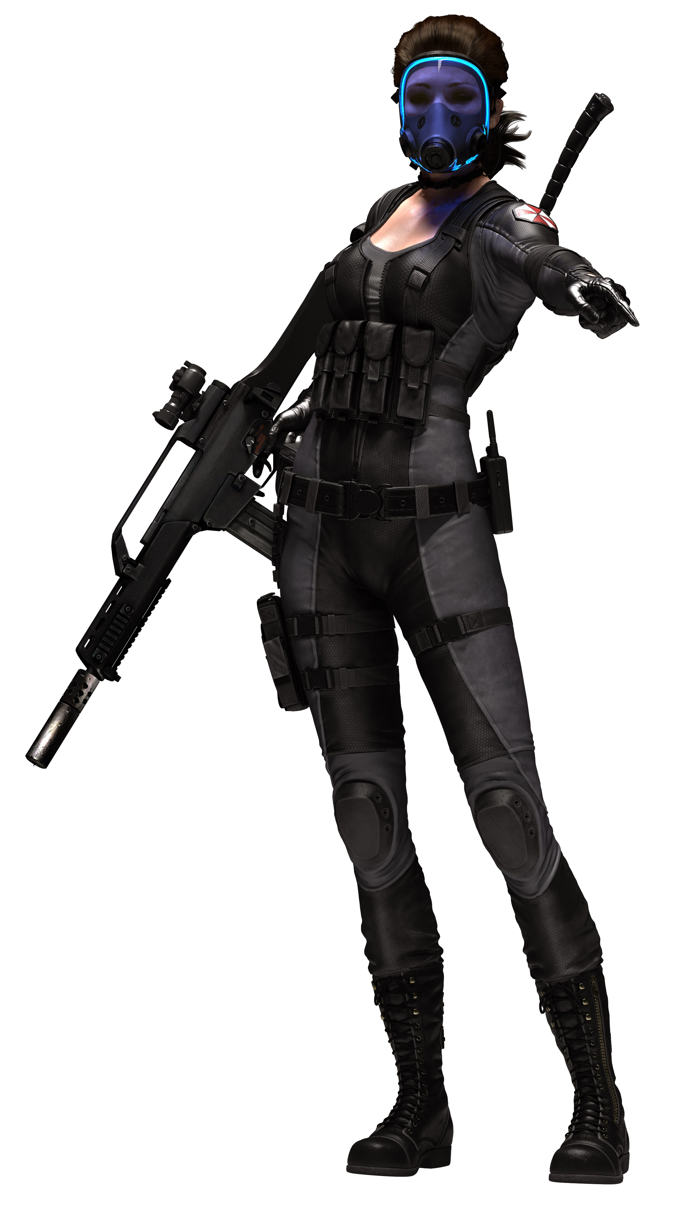 Karena wears a tight fitting black and grey combat suit. Unlike her other teammates (with the exception of Four Eyes), she wears a gas mask which reveals the top half of her face which utilizes a blue filter. Her uniform has several combat straps, and she has a handgun holster on her right thigh. Karena also has several ammo pouches on her torso and carries a sheathed combat axe on her back.