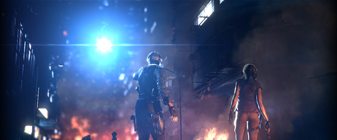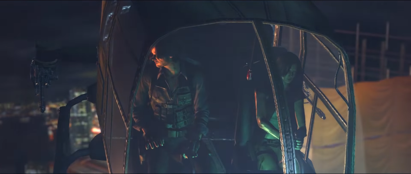 The soldier drives them through the fog to the edge of the danger zone, directing them to the Quad Tower where evacuees were being taken. Chaos reminiscent of Tall Oaks was everywhere as a stray gas tanker knocked them both out briefly. As they came to, infected citizens began to surround them until Wong suddenly appeared in a helicopter, providing them with cover-fire to make their escape. They managed to find their way to a bridge overrun with zombies that would lead directly to the Quad Tower. However, a plane set inside a building dislodged itself, starting a series of explosions that destroyed the bridge. Harper and Kennedy were forced to run, making their way to a BSAA helicopter to escape only to find the pilot was injured. Kennedy took the controls of the failing helicopter, managing to keep it suspended enough to crash through the side of the Quad Tower. Barely escaping the crash, Kennedy and Harper proceeded deeper into the tower.