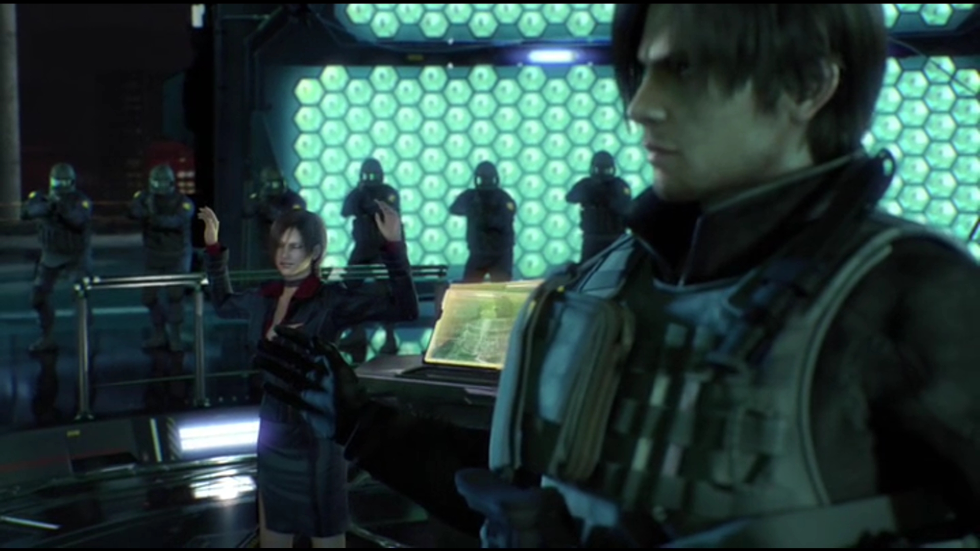 After consideration, Graham decides it is best to cover-up the incident, and the victims are declared to have gone on leave. Claire later spots Leon, much to his surprise, she confides in about her discovery about a biohazard in Penamstan. Later, the DIA investigation behind the hacking determines the stolen files discussed a bio-research facility in Shanghai, A top-secret operation is drawn up, in which Leon, Jason and Shenmei are to infiltrate the Shanghai facility. They are flown to Guam and board one of the new Virginia-class submarines at Apra Harbor, modified for SONAR stealth and provided with a modified Advanced SEAL Delivery System (ASDS) midget submarine.