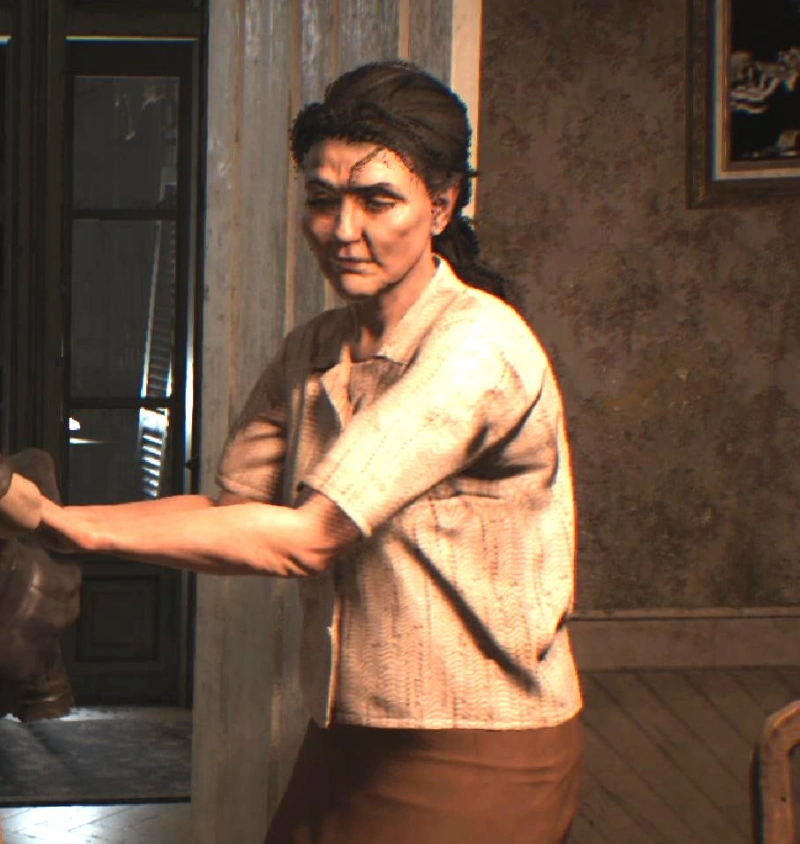 Ethan Winters, Mia's husband, arrived at the Baker house a month after the incident with the Sewer Gators in response to an email he had received from Mia under the control of Eveline. Some time after Ethan and Mia reunited and were both captured by Jack, Mia escaped captivity[4][5] and recorded a message for Ethan while she attempted to flee from a pursuing Marguerite, who was also aware of Zoe's collusion in her escape attempts. The chase led into a crawlspace in the old house, where Marguerite would corner Mia and capture her.