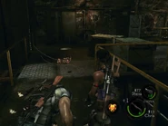 Player must run through the moving conveyor belt passage onto the next platform while facing another horde of armed majini on the way. The passage is also filled with explosive gases that can be shot to create an explosion. There's a switch which can be pull to stop the conveyor belt from moving. Head down through the stairs and turn back where player can find two crates. There's a BSAA emblem that can be found inside a trash dump. Moving ahead, player can find a weapons case that contains SIG 556 inside.