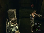 From there, a cutscene will played showing multiple of armed Majini will arrive to attack player. Player can find another crate and a red herb that is located at the back. Next, player can proceed by climbing the ladder and pass through the walkway, then jump down again. If player turn toward the left side, there will be three crates containing items. Head toward the conveyor belt passage and run the opposite the direction onto the platform. There's a door which require partner assist to enter.