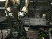 One valve is at the top of the center structure, and behind it is a Jewel beetle. Shutting it off will trigger another hoard of Majini to attack and open a path to a zip line and to another valve. Taking the zip line will cause a Chainsaw Majini to spawn. There is another zip line in the area the player can take that leads to the other valve. In this area, the play must open wood block locked door to exit, opening this door will cause another Chainsaw Majini will spawn. Defeating this one triggers a Checkpoint.