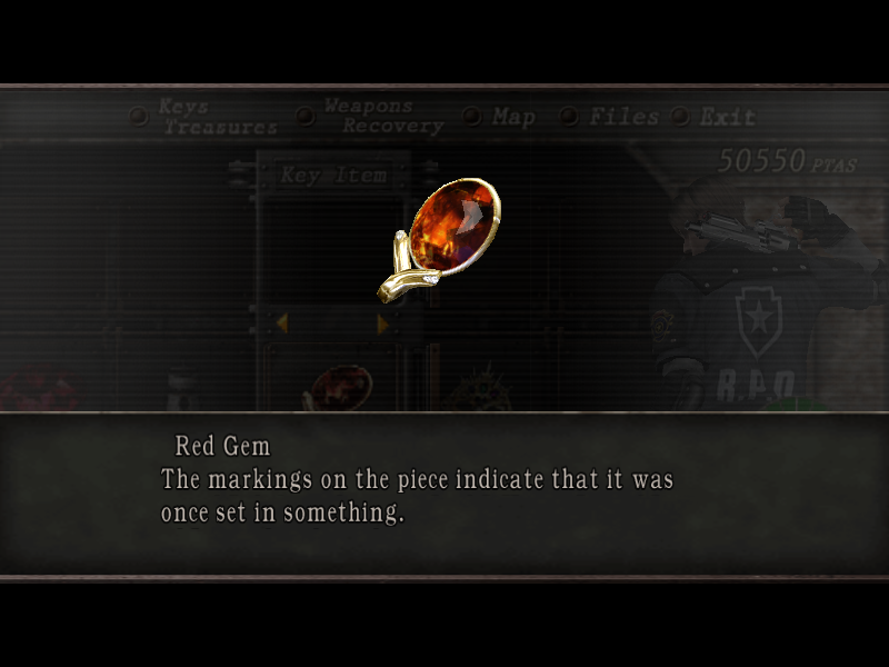 The Red Gem is treasure item found in Resident Evil 4. It is a precious stone that can be set into the Elegant Mask along with the Purple Gem and Green Gem to increase its value. It can be sold individually for 3,000₧.[1]