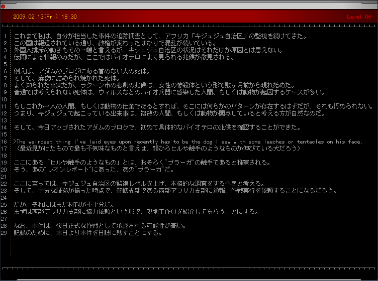 Report 909213 continues the assessment of the situation in Kijuju. Reynard Fisher begins to suspect bioterrorism is somehow involved in the strange events going on in the area. He compares the situation to Raccoon City, making reference to the murder of a woman a few months ago, and suggests there are multiple men or vicious animals at work. Reynard cites a blog by Adam which describes a dog with tentacles on its face, offering a link to the Plagas mentioned by Leon S. Kennedy. Finally, he considers arranging for the BSAA West Africa branch to send in more operatives to continue the investigation.