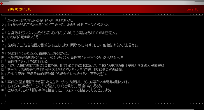 当然、 入国の際には偽装したIDを使用しているので確証はないが、 全BSAA支部の事件記録と各国の入出国記録、アーヴィングが過去に取り扱ったとされるB.O.W.とバイオテロで使用されたB.O.W.の傾向、さらには記録に残る身体的特徴等から総合的に分析すると、 ほば間違い。