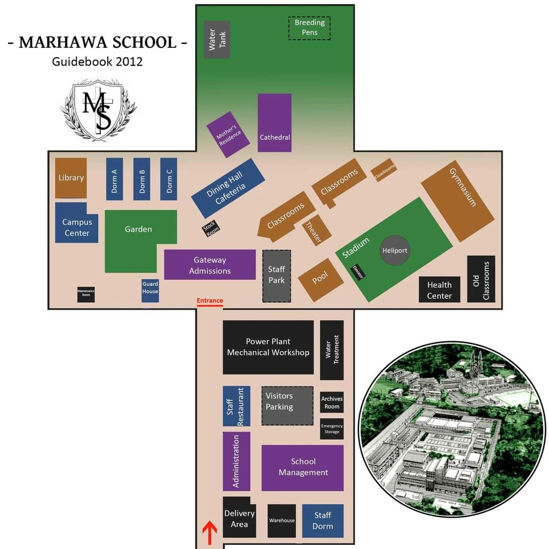 - ↑ @serizawanaoki (Apr 21, 2021). バイオハザード~マルハワデザイア~の舞台、マルハワ学園の全体MAP作った強者が!