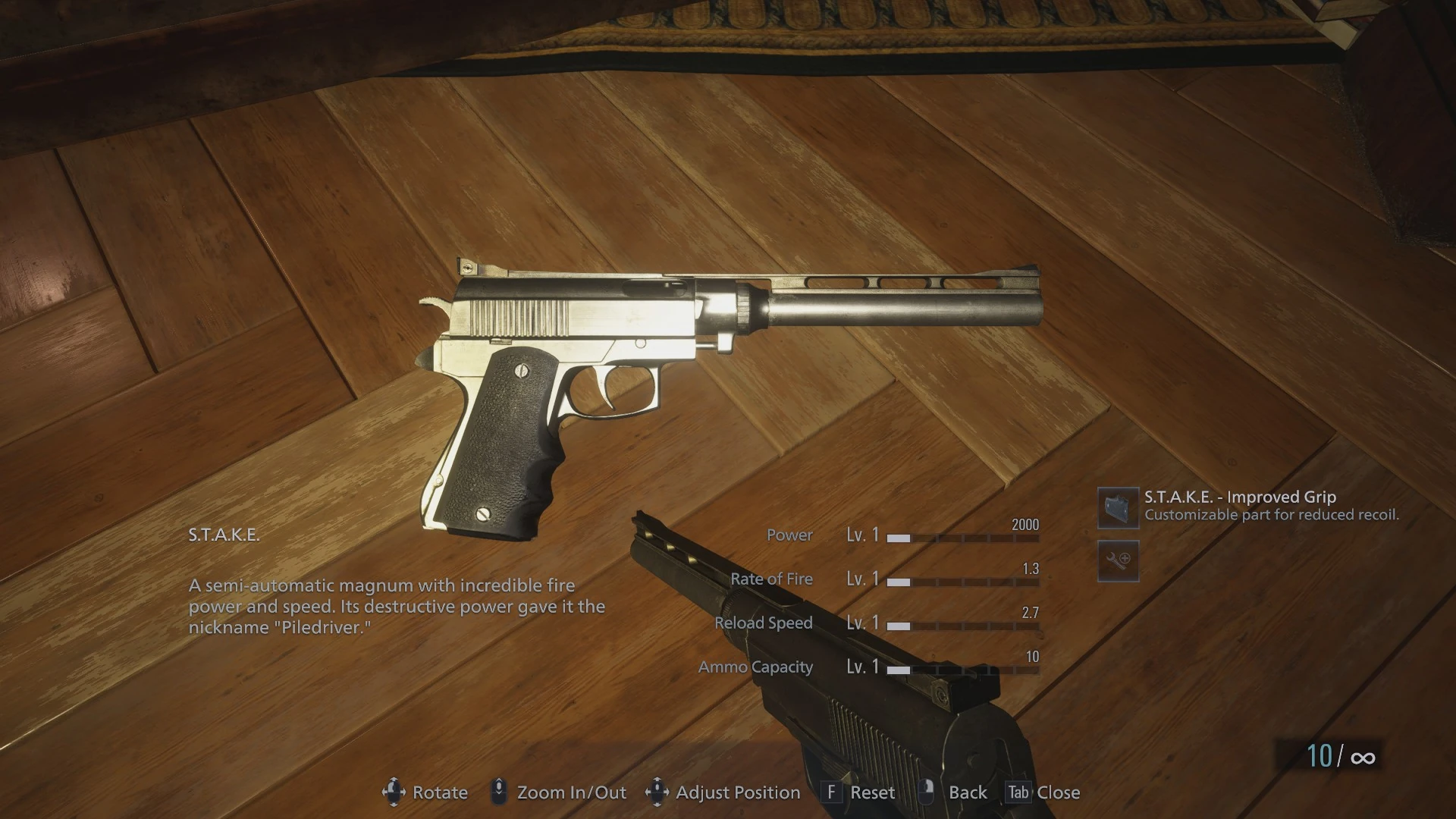 The S.T.A.K.E. is a magnum, the weapon can be upgraded with the Improved Grip and High-Capacity Mag. custom parts. The magnum takes up eight inventory slots.