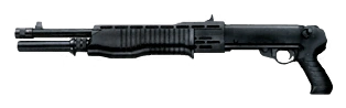 It is a SPAS-12. It's a good gun to use in short and medium distances. Uses the Shotgun Rounds (7 rounds when it is fully loaded).