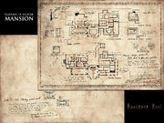 The basement level was designed as a particularly small affair. In the blueprints, a staircase from the west wing would lead directly into the kitchen. An elevator in the basement would provide quick access to the second level, just outside the library. From the kitchen a corridor would lead to the mansion's fuse box. In spite of this important task, the limestone-rich mountain rock made the basement a flood risk and, likely aware of this risk, Trevor talked with a local electrical company about installing safety devices.[1] In the completed mansion, this corridor also led into the east wing, directly beneath Trevor's tombstone.