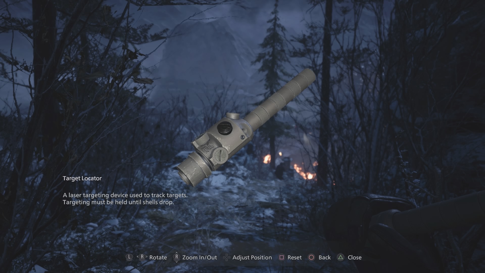 The Target Locator is exclusive to Chris Redfield, it must be pointed at the roots of the Mold located at the Maiden of War. It has a delay between shots so that Lobo reloads it, and players must point it toward the target for a few seconds before it will be shot. The Target Locator takes up four inventory spaces.