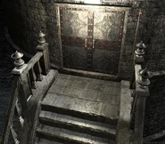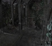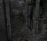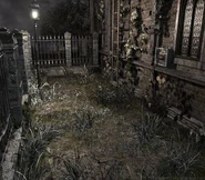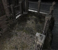 In the eastern annex against the chapel, a box of Shotgun ammo can be recovered on Easy mode. Near the elevator on the left (depicted in green on the image to the left), two Green Herbs and one Red Herb can also be found, but also only on Easy.[1] In terms of enemies, two Zombies will be found roaming around this room.[2]
